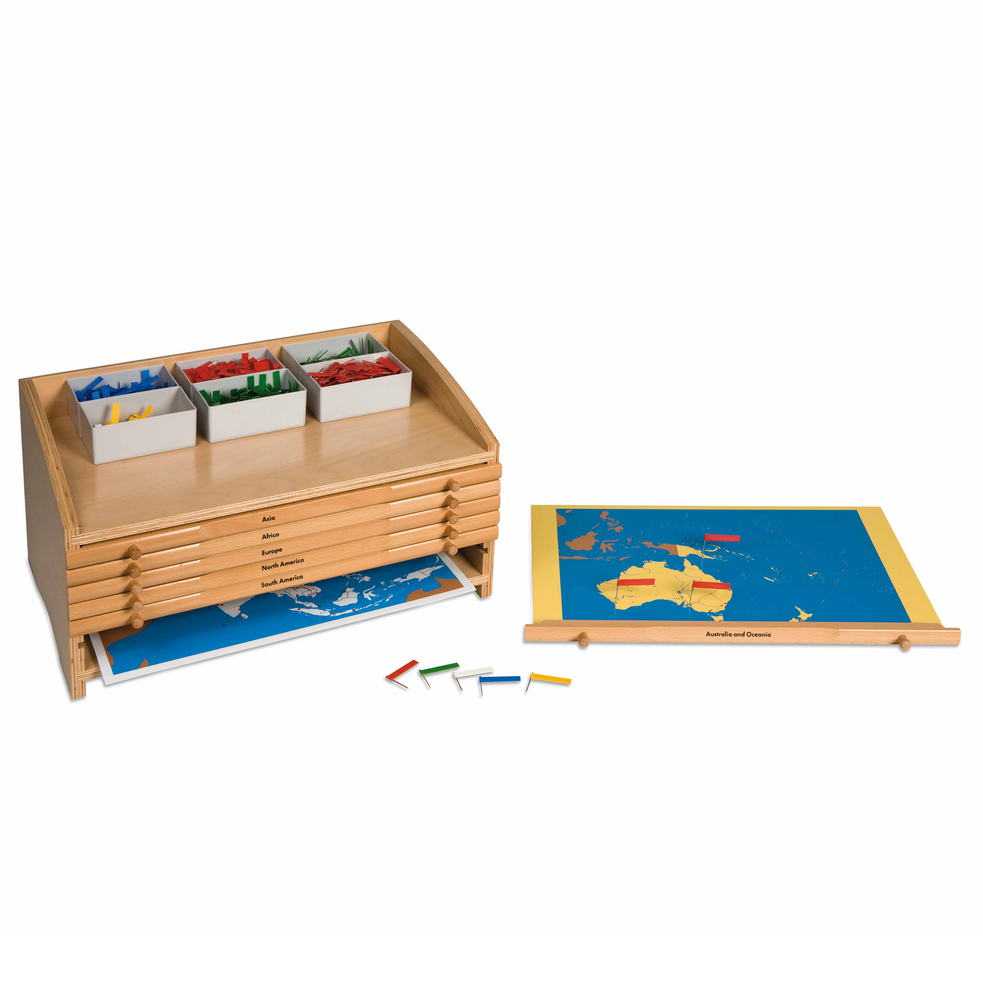 Das Kontinente-Kabinett enthält 6 Karten, mit denen das Kind die wichtigsten geografischen und politischen Teile der Kontinente der Welt identifizieren kann. Das Kind steckt mit unterschiedlichen Farben beschriftete Stecknadeln in die Löcher der Karten, um die Hauptmerkmale jedes Landes zu identifizieren: Grün für Länder, Rot für Städte, Blau für Wasser, Gelb für Berge und Weiß für es. Die Ausstattung besteht aus einem Schrank aus Buchensperrholz mit 6 Karten, Steckfahnenboxen, Kontrollkarten und selbstklebenden Etiketten zum Anbringen an den Fahnen.
